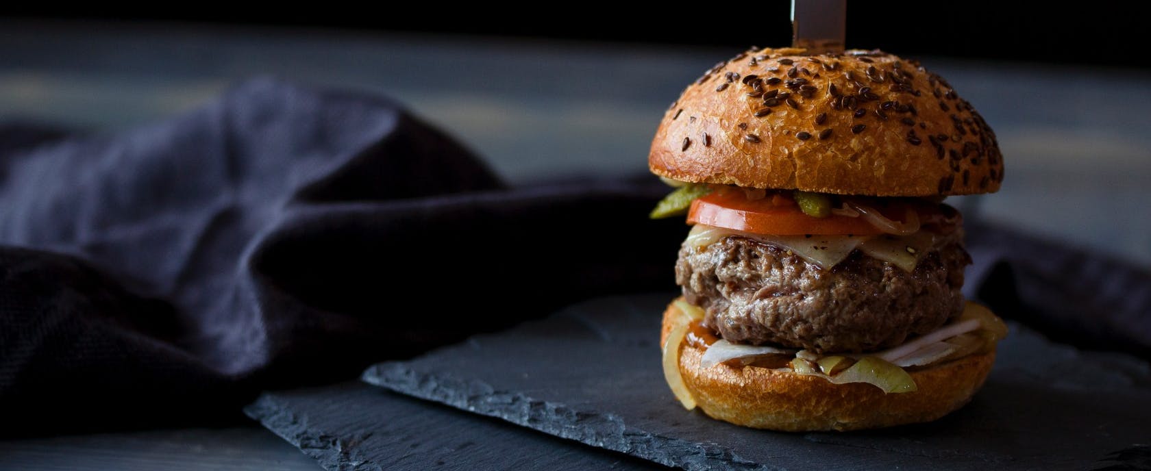 domáca žemľa, kečup, tatarská omáčka, bravčové mäso, dvojitý grilovaný syr Eidam, kyslá uhorka, paradajka, ľadový šalát + nápoj